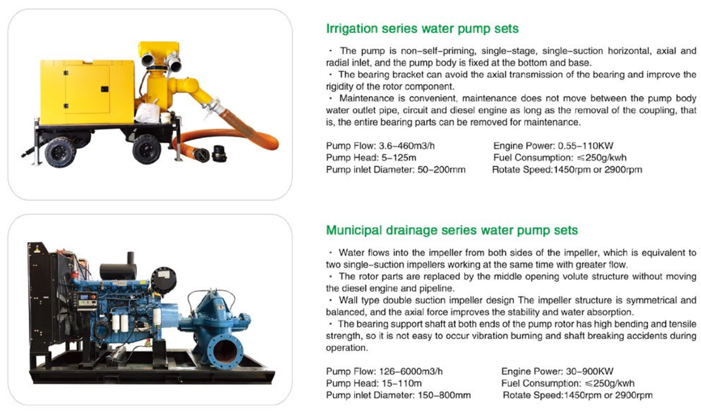 The water pump sets are powered by diesel engines through flexible couplings, offering a robust combination of efficiency and reliability. Key advantages include a well-engineered structure, high operating efficiency, excellent cavitation resistance, low vibration, reduced noise levels, and stable long-term performance. The design also allows for easy assembly, disassembly, and maintenance.